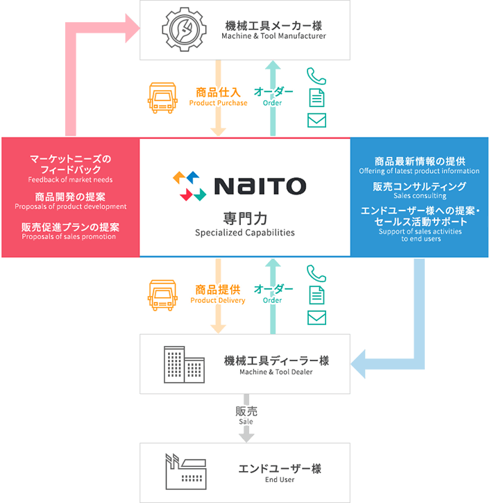 NaITOは、切削工具、計測、産業機器、工作機械等の多品種におよぶ取扱商品群を、国内外の事業パートナーに